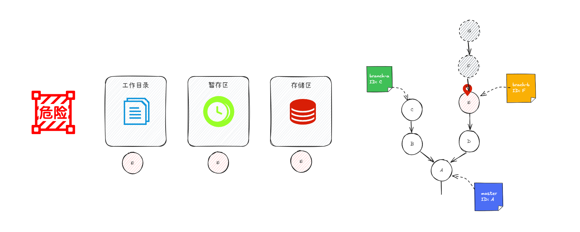 该命令会从存在区将HEAD移动到提交E,并将提交E的快照覆盖到暂存区和工作目录,此时运行 git status 命令后显示工作树是干净的。