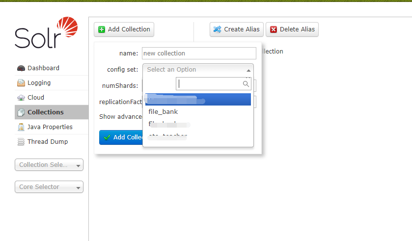 上传成功后,在solr 后台创建collection时可以看到之前命名的配置文件file_bank。