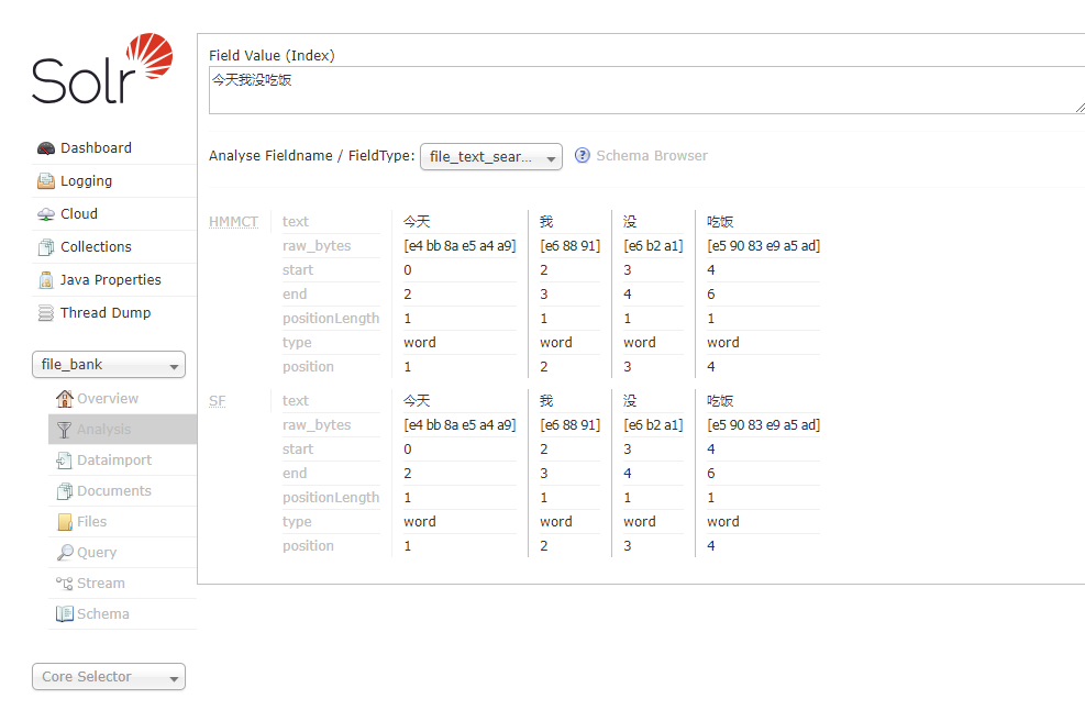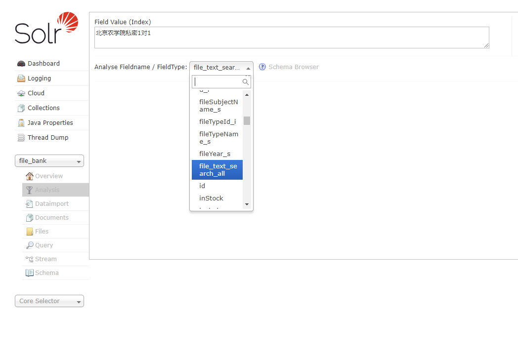 collection选择file_bank,在Analysis菜单中,选择file_text_search_all 字段,输入待分词文本