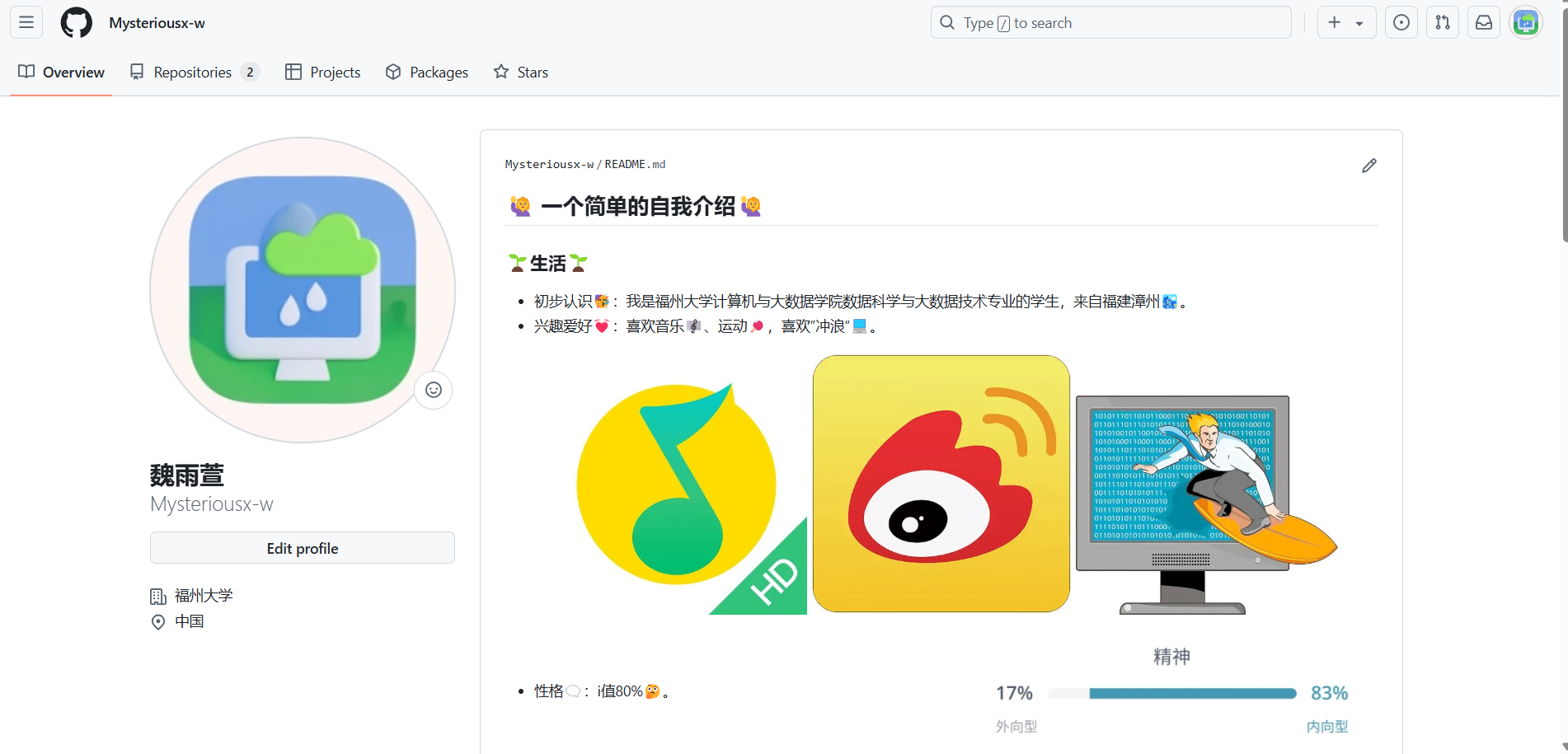 这里使用了第一种方式,在GitHub新建一个与自己GitHub ID一致的仓库,在仓库根目录的README中写自我介绍