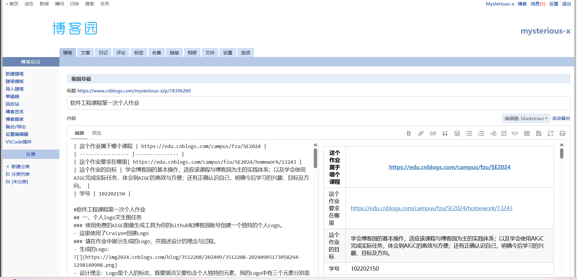 | 这个作业的目标 | 学会博客园的基本操作,适应该课程与博客园为主的实践体系;以及学会使用AIGC完成实际任务,体会到AIGC的高效与方便;还有正确认识自己,明确今后学习的兴趣、目标及方向。 |