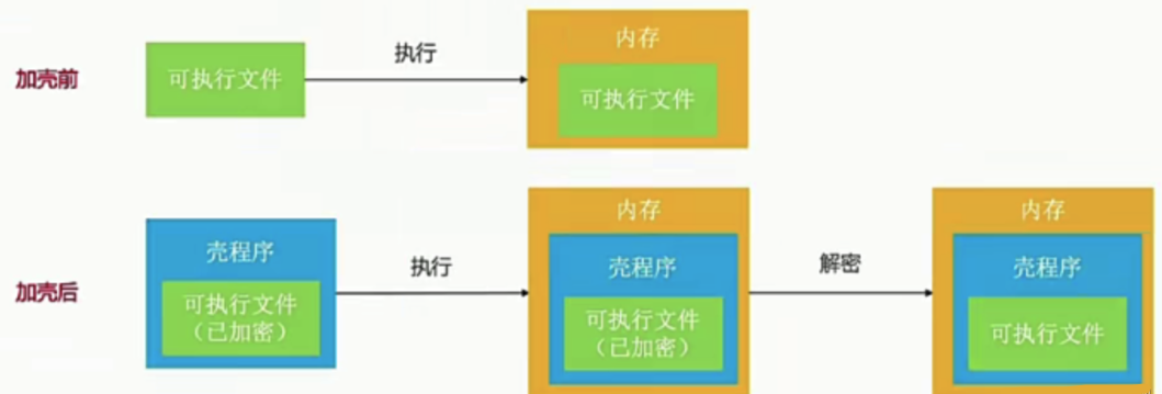 系统在执行这个新程序的时候,先去执行壳程序,由壳对原程序进行解压(或解密)并还原到内存中去,系统将正常执行原来的程序。