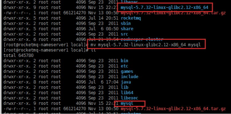 [root@rocketmq-nameserver1 mysql]# chown -R mysql.mysql /usr/local/mysql