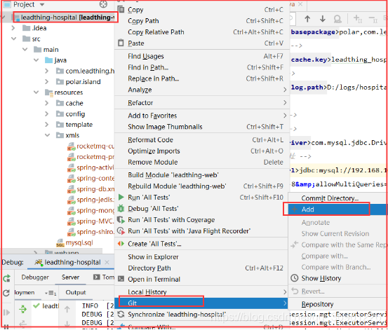 第三步: 在idea中点击项目目录右键,此时会出现一个git,这是仓库创建成功才会有的。然后点击add添加到缓冲区