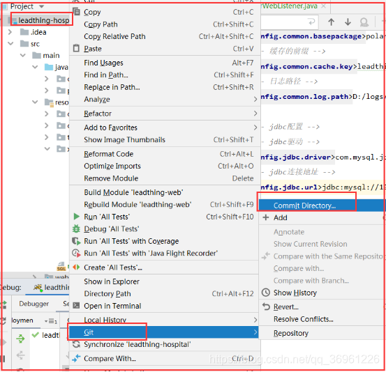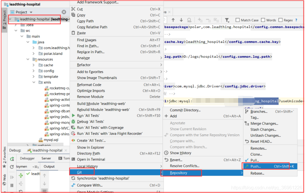 第五步:上传到远程git服务器,项目右键,依次点击图片上面的提示提交,通过git提交到远程git服务器上面去。