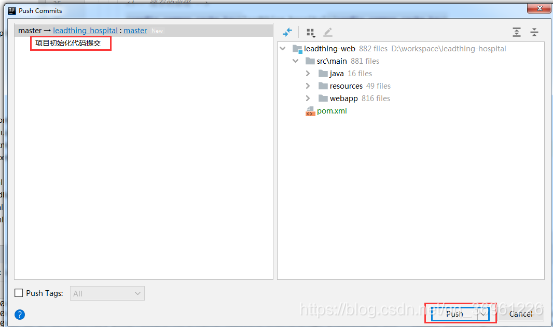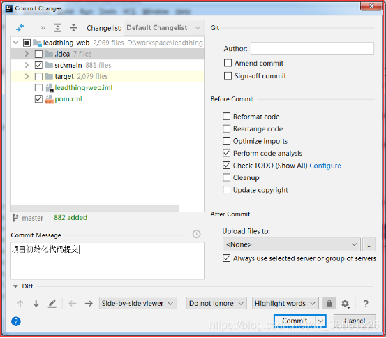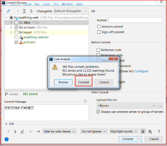 此时会选择需要上传的代码,添加备注后点击Commit按钮