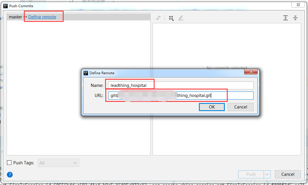 点击Pull后 会跳转到下面页面,点击 Define remote按钮,输入用户名和URL远程git的地址,点击OK按钮