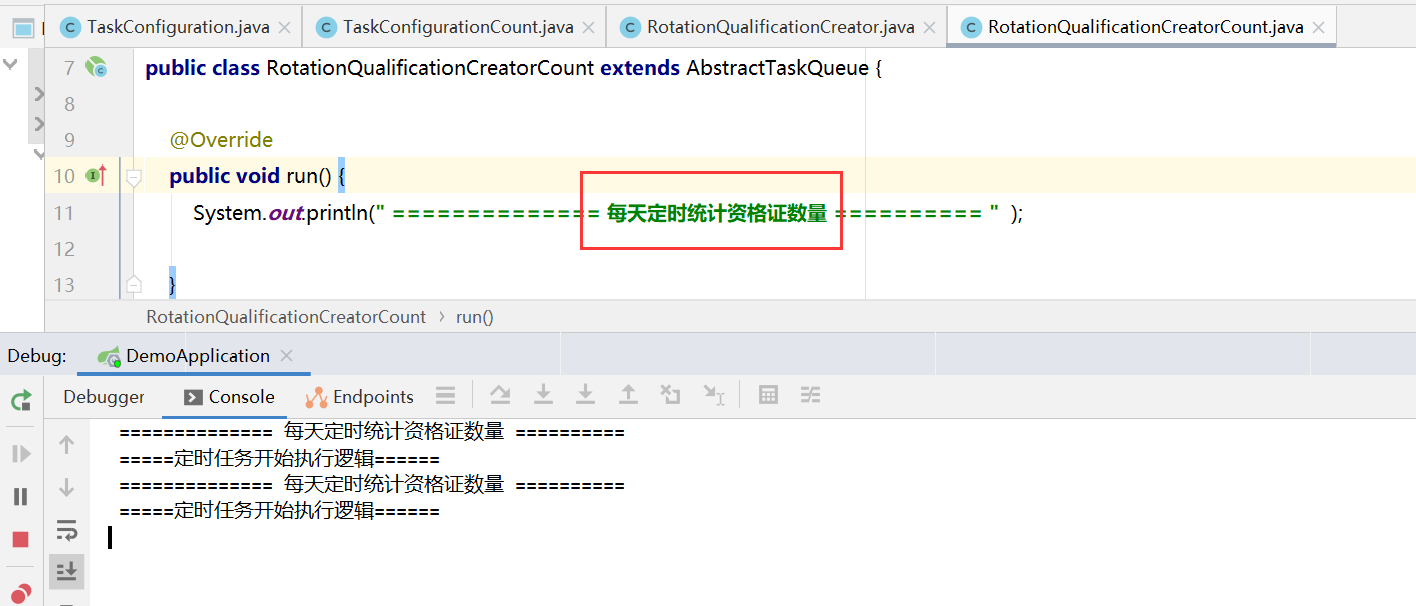 System.out.println(" ============== 每天定时统计资格证数量 ========== " );