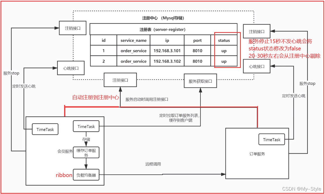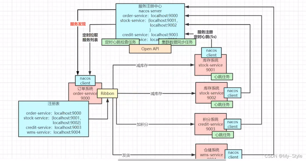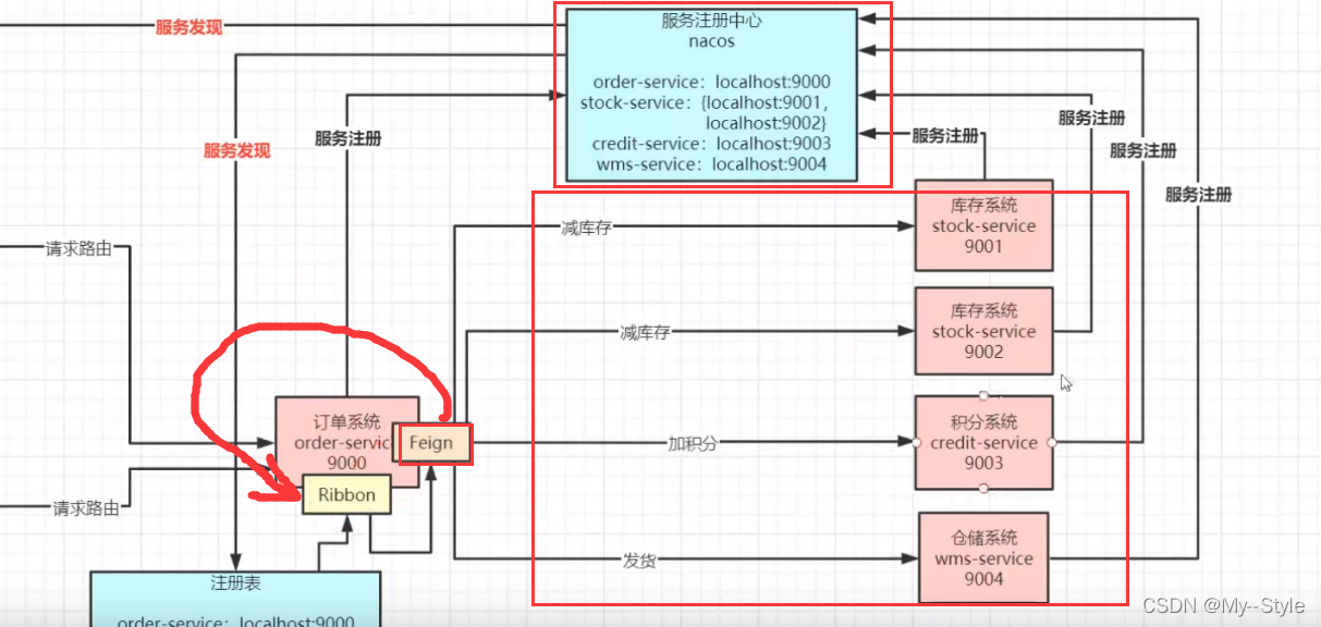 减少库存、加积分等服务启动的时候会往nacos注册中心注册自己的服务信息,例如ip、端口等。