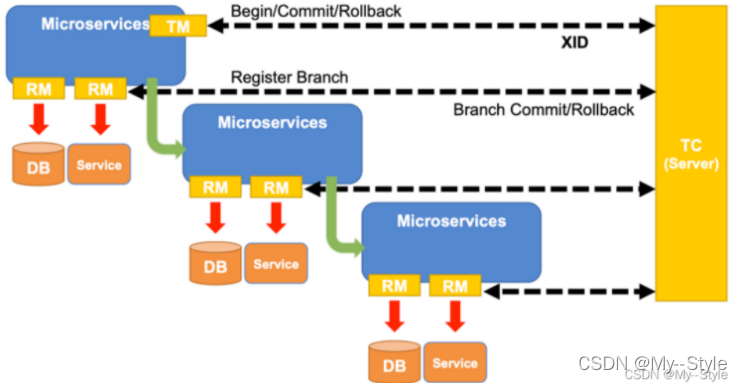 分布式事务协调者,通过@GlobalTransactional开启全局事务,产生一个XID,向TC开启一个全局事务,其他子服务使用@Transactional使用本地事务,