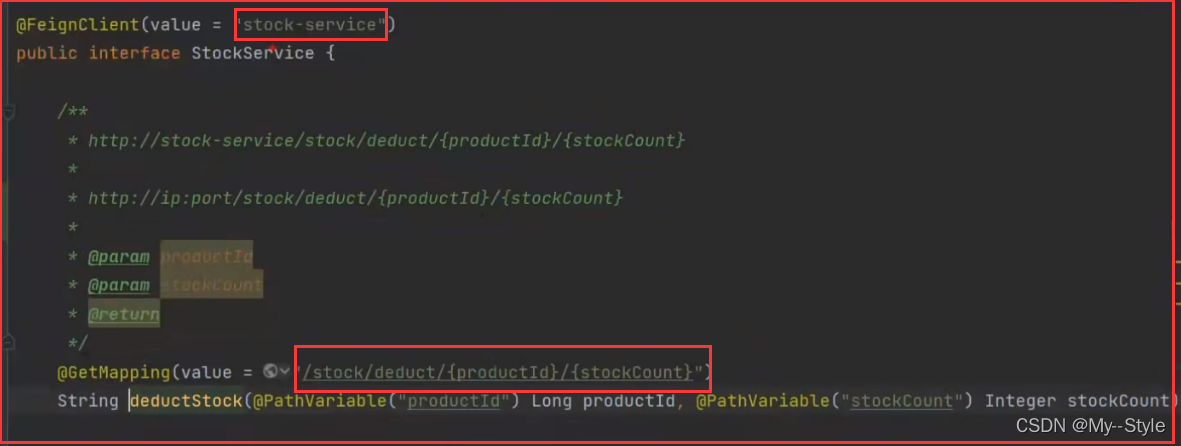 当调用某个接口的时候,底层代理对象会将@FeignClient(value ="stock-service") 的value值和接口的@GetMapping("/stock/deduct/{productId}/{stockCount}")值拼接一个可以直接访问的url地址 :http://stock-service/stock/deduct/{productId}/{stockCount}
