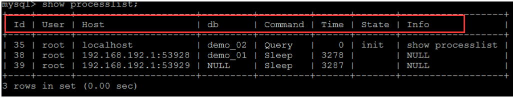1) id列,用户登录mysql时,系统分配的"connection_id",可以使用函数connection_id()查看