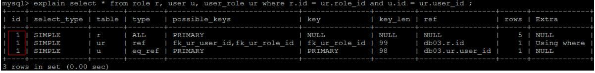 explain select * from t_role r, t_user u, user_role ur where r.id = ur.role_id and u.id = ur.user_id ;