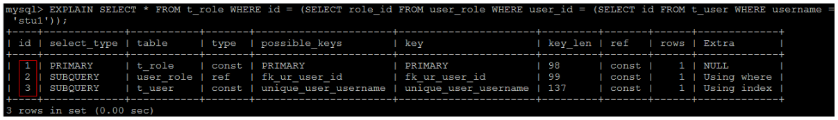 EXPLAIN SELECT * FROM t_role WHERE id = (SELECT role_id FROM user_role WHERE user_id = (SELECT id FROM t_user WHERE username = 'stu1'))