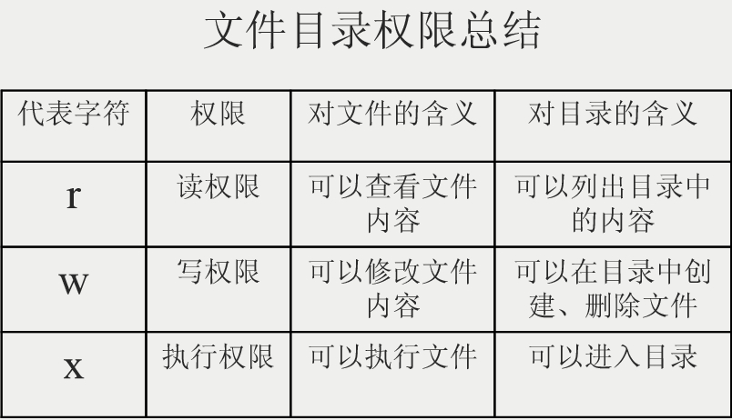 r: read 读权限。 w:write 写权限。 x:execute 执行权限。