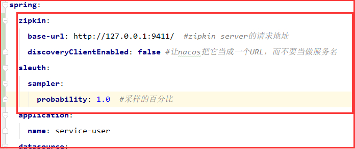 zipkin: base-url: http://127.0.0.1:9411/ #zipkin server的请求地址 discoveryClientEnabled: false #让nacos把它当成一个URL,而不要当做服务名 sleuth: sampler: probability: 1.0 #采样的百分比