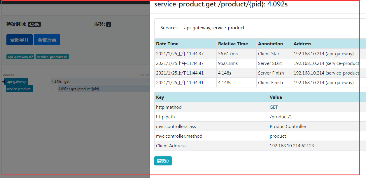 其中 5399d5cb061971bd 是TraceId, 5399d5cb061971bd 是SpanId,依次调用有一个全局的TraceId,将调用链路串起来。仔细分析每个微服务的日志,不难看出请求的具体过程。