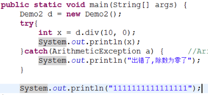 System.out.println( e.getMessage()); 获取异常信息,返回字符串。 //输出 : / by zero获取异常信息