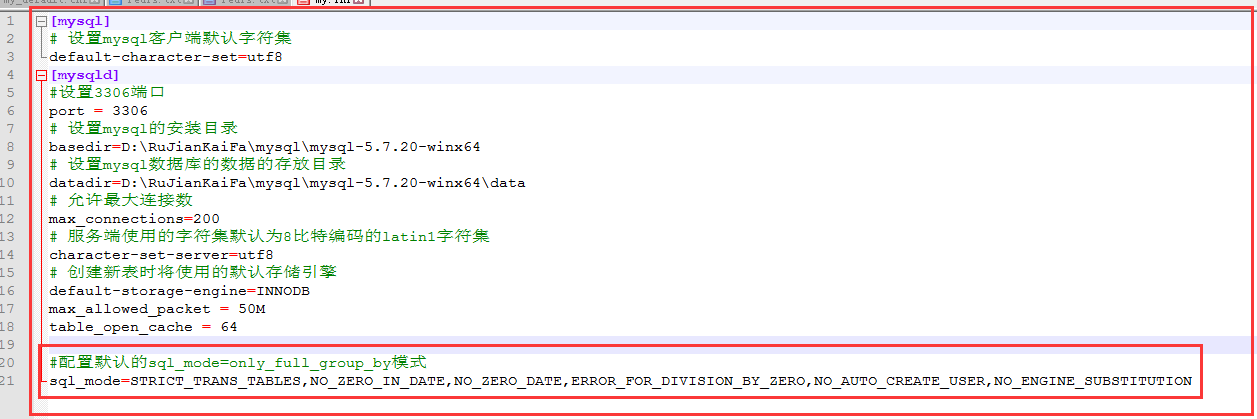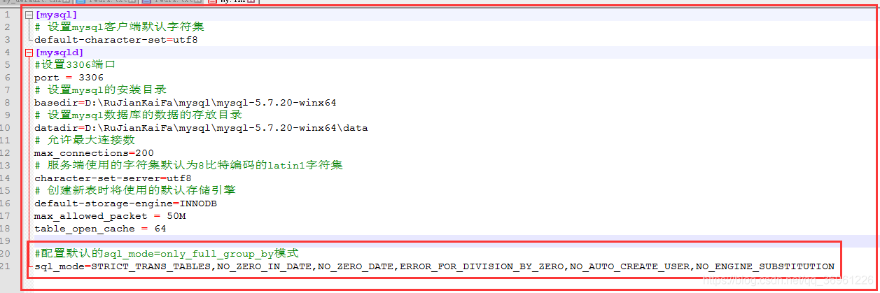 在最后添加 配置默认的sql_mode=only_full_group_by模式,保存后重启mysql数据库即可