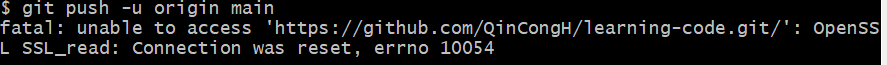 fatal: unable to access 'https://github.com/QinCongH/learning-code.git/': OpenSSL SSL_read: Connection was reset, errno 10054