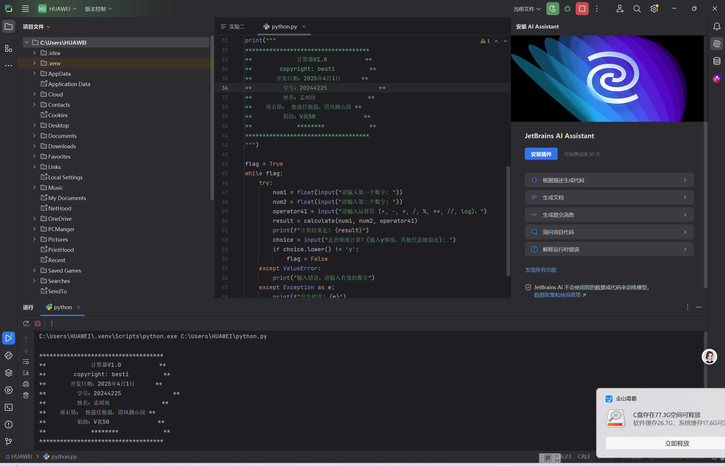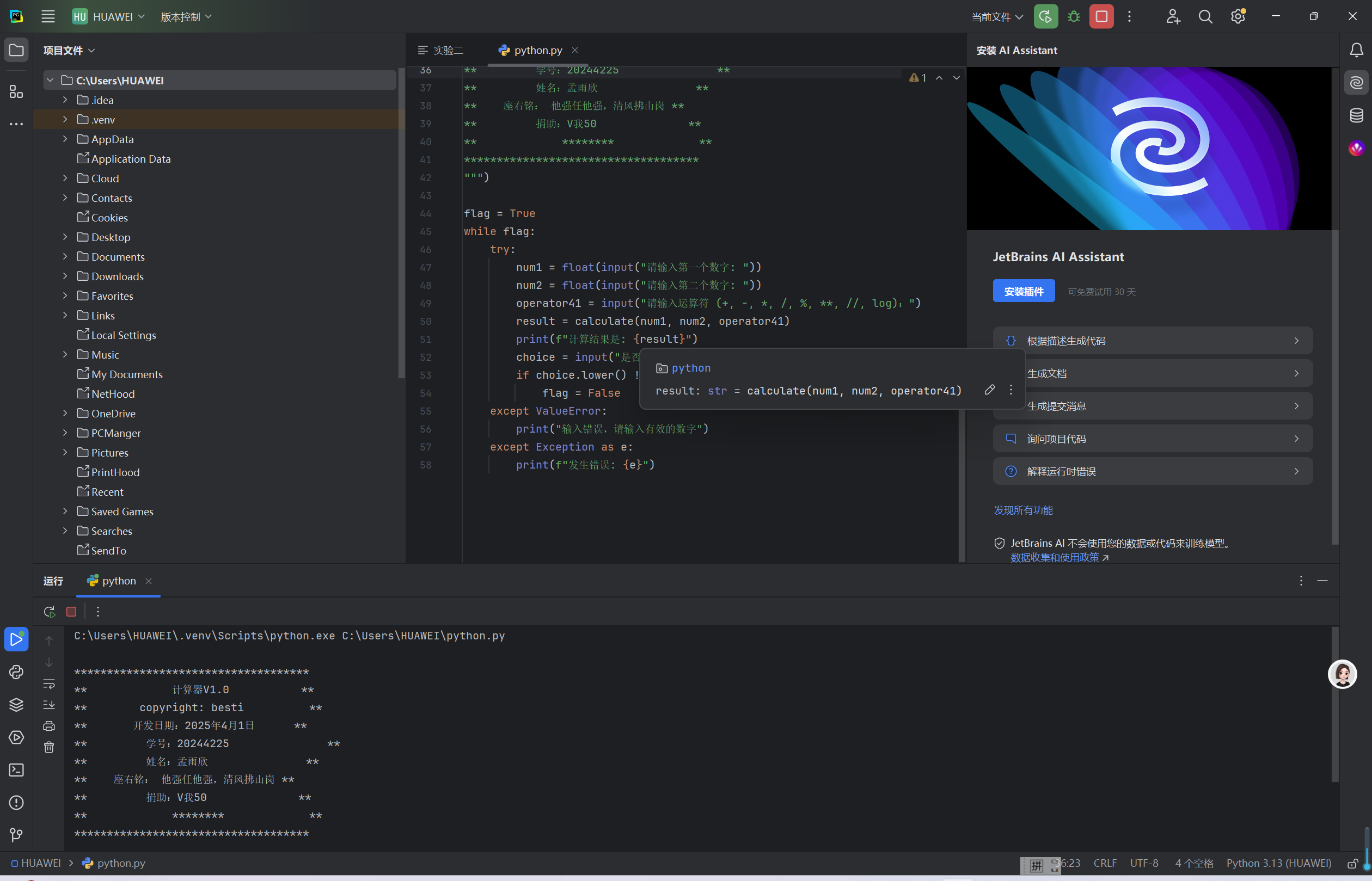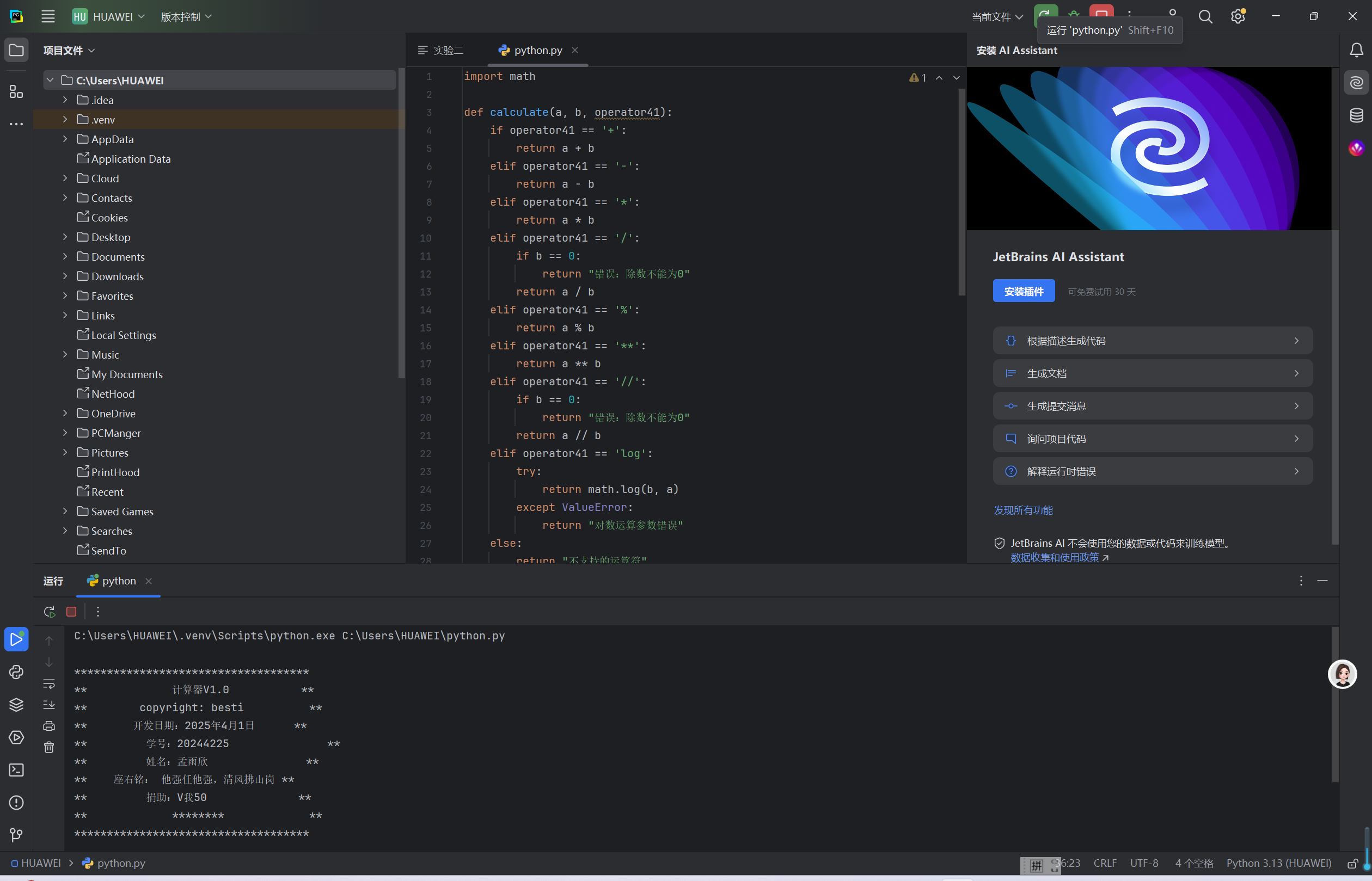 学习用Python编辑计算器,开启了我编程探索的奇妙旅程。起初,我以为只是简单的运算实现,实际操作才发现困难重重,像输入验证、运算优先级处理等问题接踵而至。但每一次解决问题,都让我对Python语法和逻辑有了更深理解。在不断调试代码的过程中,我深刻体会到编程需要极度的细心和耐心,一个小错误都可能导致程序无法运行。这次经历不仅提升了我的编程能力,更让我懂得,面对复杂问题,只要保持钻研精神,就一定能找到解决方案。