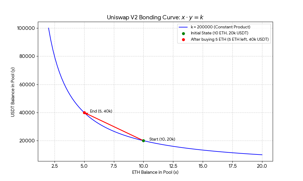 你看,为了维持 $k$ 不变,当你把 ETH 的库存从 10 买到剩 5 时,USDT 的库存被迫从 20,000 飙升到了 40,000(你需要支付 20,000 USDT!)。 -