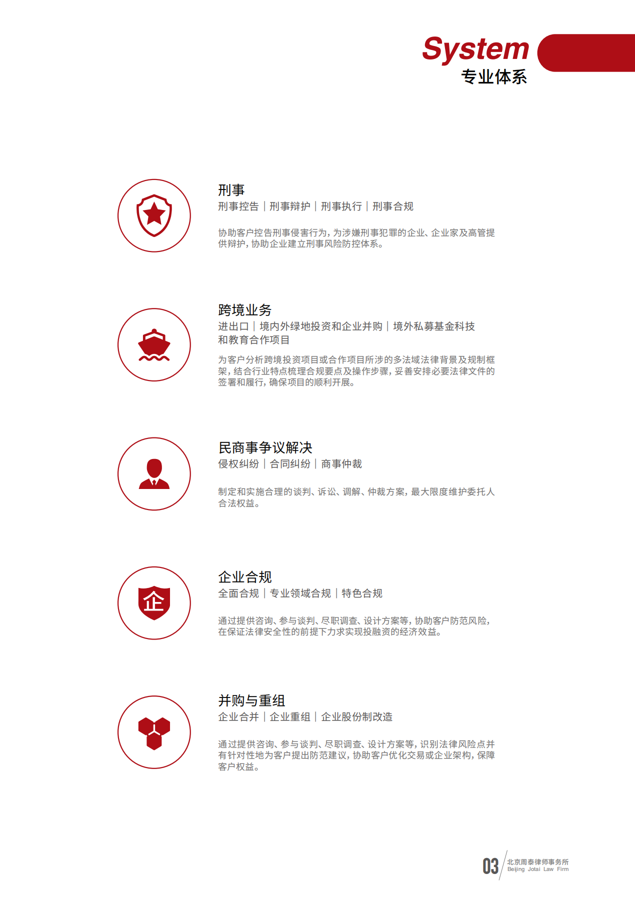 北京周泰律师事务所创设于2020年,致力于为客户重大、复杂的法律事务提供一体化解决方案。律所的专业体系涵盖刑事、跨境业务、民商事争议解决、企业合规、并购与重组、危机处理、知识产权、劳动等多个领域。