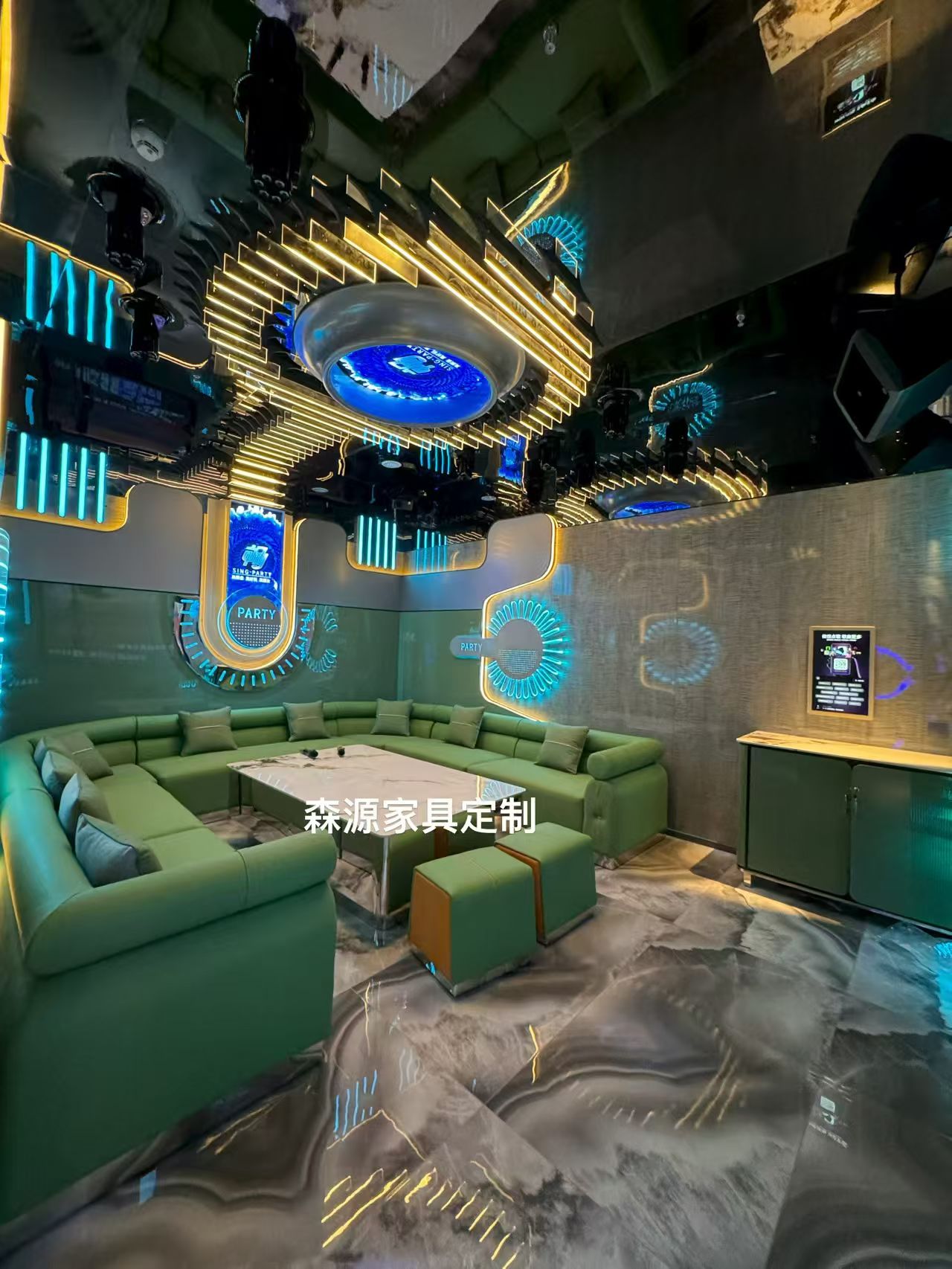 服务酷秀KTV连锁(全国30+门店),通过模块化定制适配异形门店,批量交付合格率100%,助力品牌扩张;为大同钱柜KTV定制轻奢风家具,选用304不锈钢、高密度海绵等优质原料,客单价提升30%;为雄安新区国际KTV定制异形家具,40天完成交付,提前5天开业,首月客流破1.2万人次,成为区域示范项目。