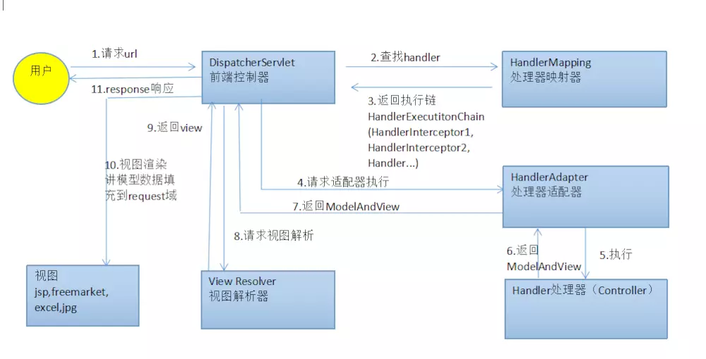 1.用户发送请求至前端控制器DispatcherServlet