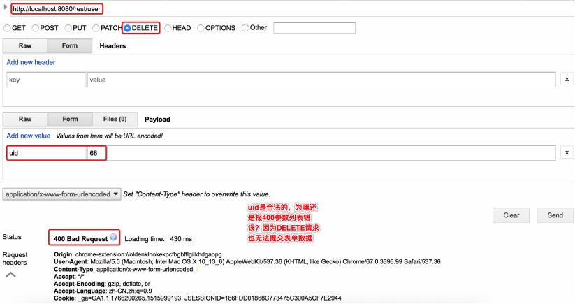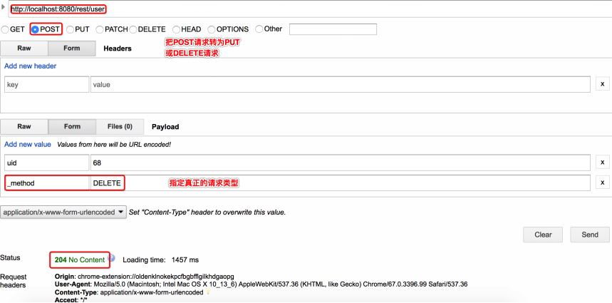 再次测试,需要在请求中添加_method参数,指定请求方式为DELETE请求: