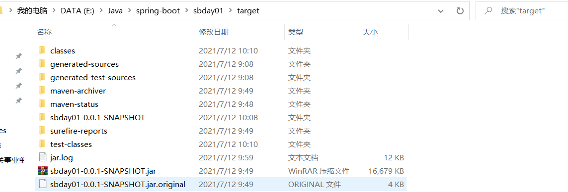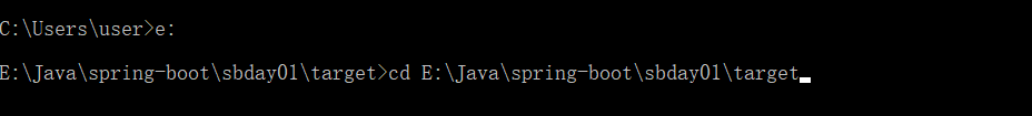 在cmd命令行窗口切换到jar包所在文件夹e:、cd:E:\Java\spring-boot\sbday01\target