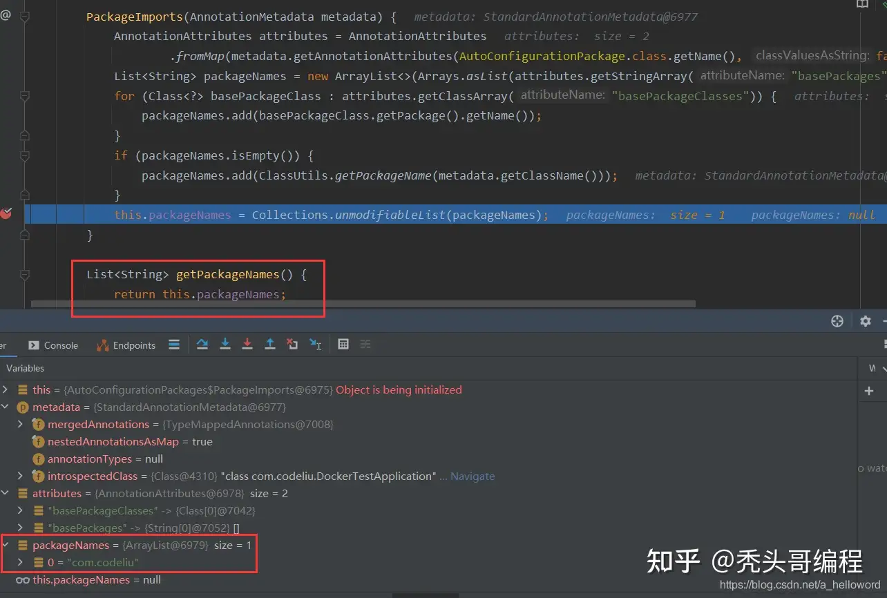 我们进入PackageImports类,在对应行上打上断点进行调试,看看项目启动后这些值是什么