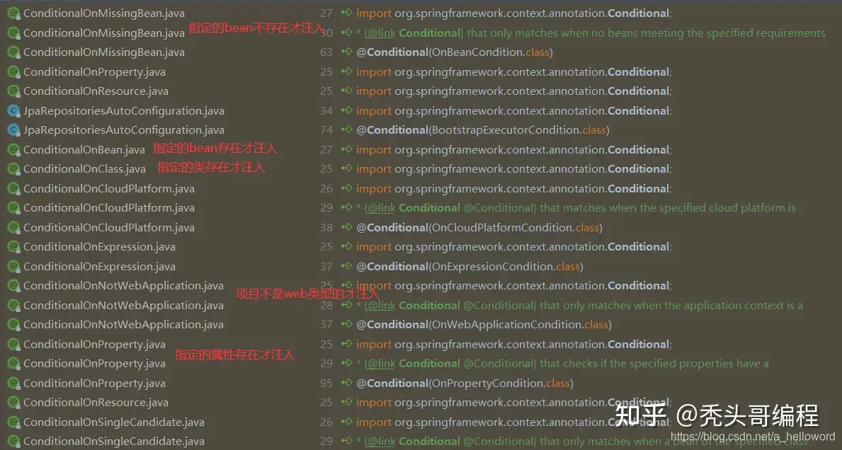 SpringBoot在启动的时候为我们加载了这么多组件,我们不可能全部用得上,那如果用不上的还注册进容器,岂不是耗费资源。其实底层使用了条件装配@Conditional,在我们需要的情况下才会注册对应的组件。