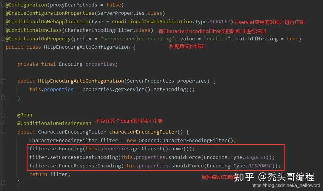 首先应用是Servlet应用以及存在CharacterEncodingFilter类的时候,才会进行注册。而且该类和配置文件进行了绑定,可以在配置文件中对属性进行赋值。在注册CharacterEncodingFilter的时候,如果系统中不存在这个bean的时候,才会进行注册,防止重复注册,并且组件的值是进行动态赋值的,即如果我们编码不想使用utf-8,那我们可以在配置文件中进行修改,系统注册时候,就会使用我们自定义的值。