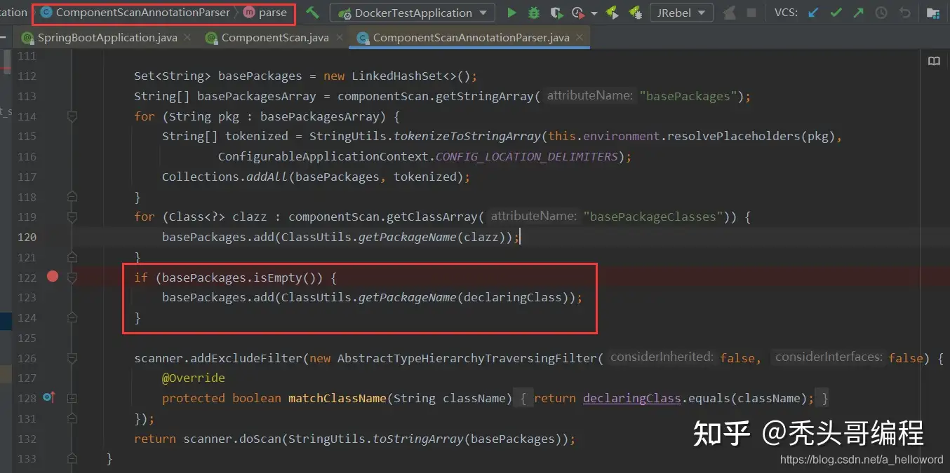 获取默认扫描路径在代码在ComponentScanAnnotationParser类的parse方法中,在对应的行打上断点,启动主类进行调试