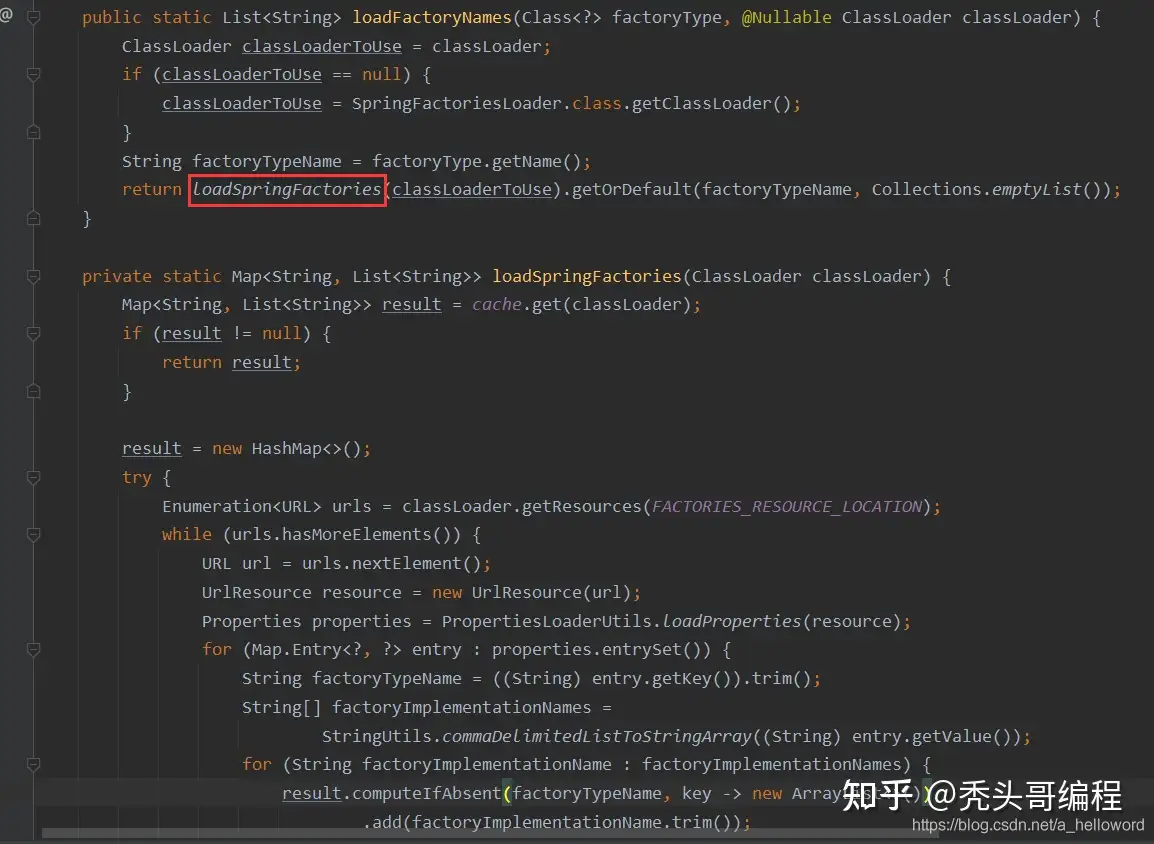 该方法中调用loadFactoryNames方法,而loadFactoryNames方法则调用loadSpringFactories方法, 利用工厂加载得到所有META-INF/spring.factories文件中的组件。