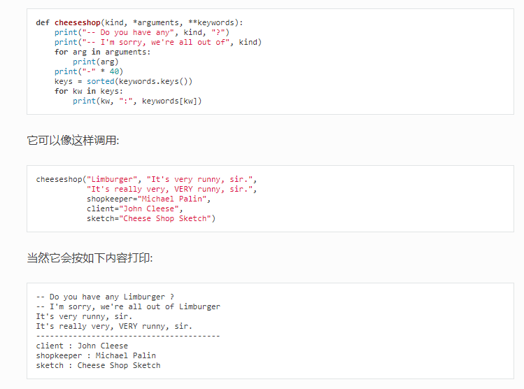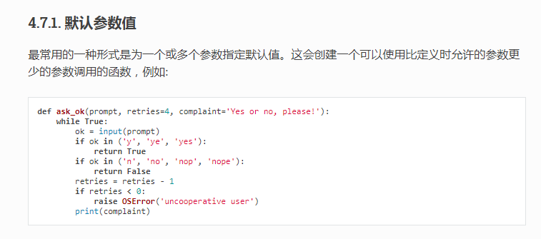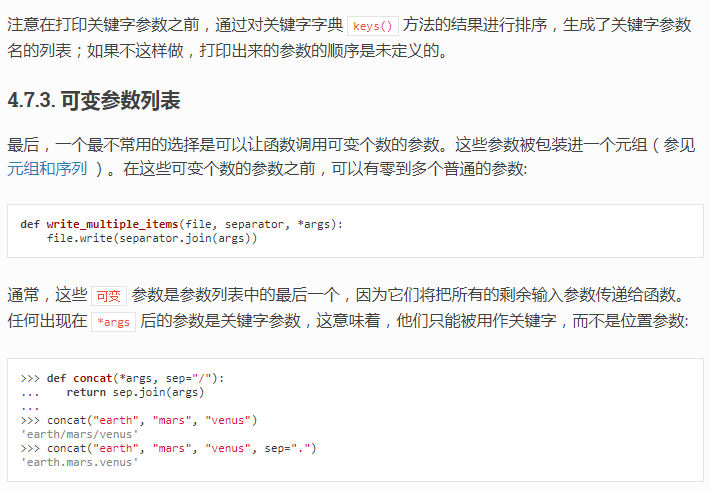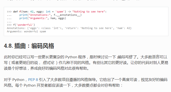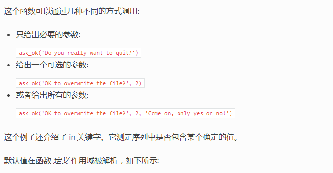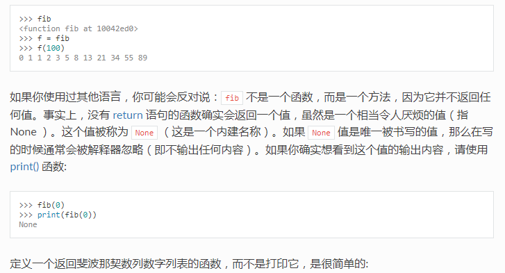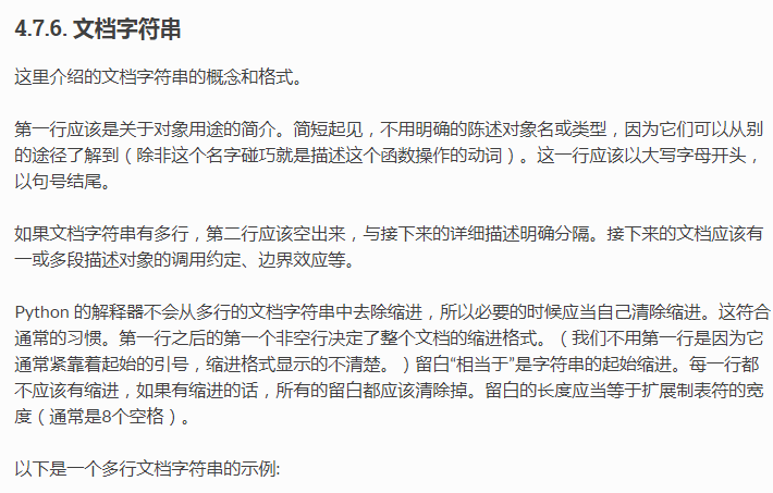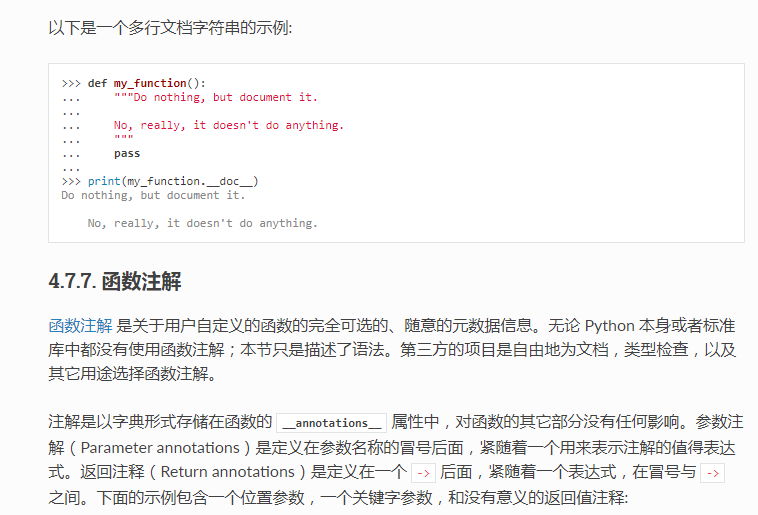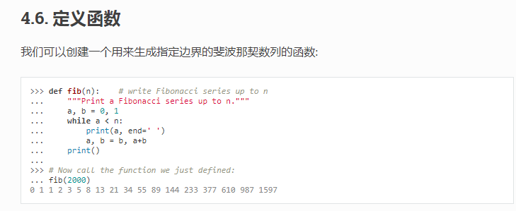 函数体的第一行语句可以是可选的字符串文本,这个字符串是函数的文档字符串,或者称为 docstring。(更多关于 docstrings 的信息请参考 文档字符串) 有些工具通过 docstrings 自动生成在线的或可打印的文档,或者让用户通过代码交互浏览;在你的代码中包含 docstrings 是一个好的实践,让它成为习惯吧。