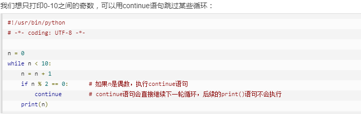 x=10 >>> while x: x=x-1 if x %2 !=0: continue print(x) 8 6 4 2 0