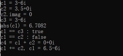 #include<iostream> #include<math.h> using namespace std; class Complex { public: Complex(); Complex(double real1,double imag1); Complex(double real1); Complex(const Complex &r); double get_real() const; double get_imag() const; void show() const; void add(Complex &a); friend Complex add(const Complex &c1,const Complex &c2); friend bool is_equal(const Complex &c1,const Complex &c2); friend double abs(const Complex &x1); private: double real,imag; }; Complex::Complex():real(0),imag(0) { } Complex::Complex(double real1) { real=real1; imag=0; } Complex::Complex(double real1,double imag1) { real=real1; imag=imag1; } Complex::Complex(const Complex &r) { real=r.real; imag=r.imag; } double Complex::get_real() const { return real; } double Complex::get_imag() const { return imag; } void Complex::add(Complex &a) { real=real+a.real; imag=imag+a.imag; } void Complex::show() const { double n1,n2; n1=get_real(); //cout<<n1<<endl; n2=get_imag(); if(n1==0&&n2==0) { cout<<n1; } else { if(n1==0) { cout<<n2<<"i"; } else { if(n2==0) { cout<<n1; } else { if(n2>0) cout<<n1<<"+"<<n2<<"i"; else cout<<n1<<n2<<"i"; } } } } Complex add(const Complex &c1,const Complex &c2) { Complex c3; c3.real=c1.real+c2.real; c3.imag=c1.imag+c2.imag; return c3; } double abs(const Complex &x1) { double x; x=sqrt(x1.real*x1.real+x1.imag*x1.imag); return x; } bool is_equal(const Complex &c1,const Complex &c2) { if(c1.real==c2.real&&c1.imag==c2.imag) return true; else return false; }