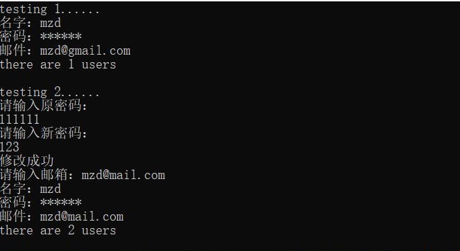 #include<iostream> #include<string> using namespace std; class User { public: User(string name1); User(string name1,string password1,string email1); void set_email(); void change_passwd(); void print_info(); static void print_n(); private: string name,password,email; static int n; }; int User::n=0; User::User(string name1) { name=name1; password="111111"; email=""; n++; } User::User(string name1,string password1,string email1) { name=name1; password=password1; email=email1; n++; } void User::set_email() { string t; cout<<"Enter email address:"; cin>>t; email=t; cout<<"email is set successfully···"<<endl; } void User::change_passwd() { string t0,t1; cout<<"Enter old password:"; for(int i=1;i<=3;i++) { cin>>t0; if(t0==password) { cout<<"Enter new password:"; cin>>t1; password=t1; break; } else if(i<=2) { cout<<"password input error. Please re-enter again:"; } else cout<<"password input error. Please try after a while."<<endl; } } void User::print_info() { cout<<"name:"<<name<<endl; cout<<"passwd:"<<"******"<<endl; cout<<"email:"<<email<<endl; } void User::print_n() { if(n==1) cout<<"there are "<<n<<" user."<<endl; else cout<<"there are "<<n<<" users."<<endl; }