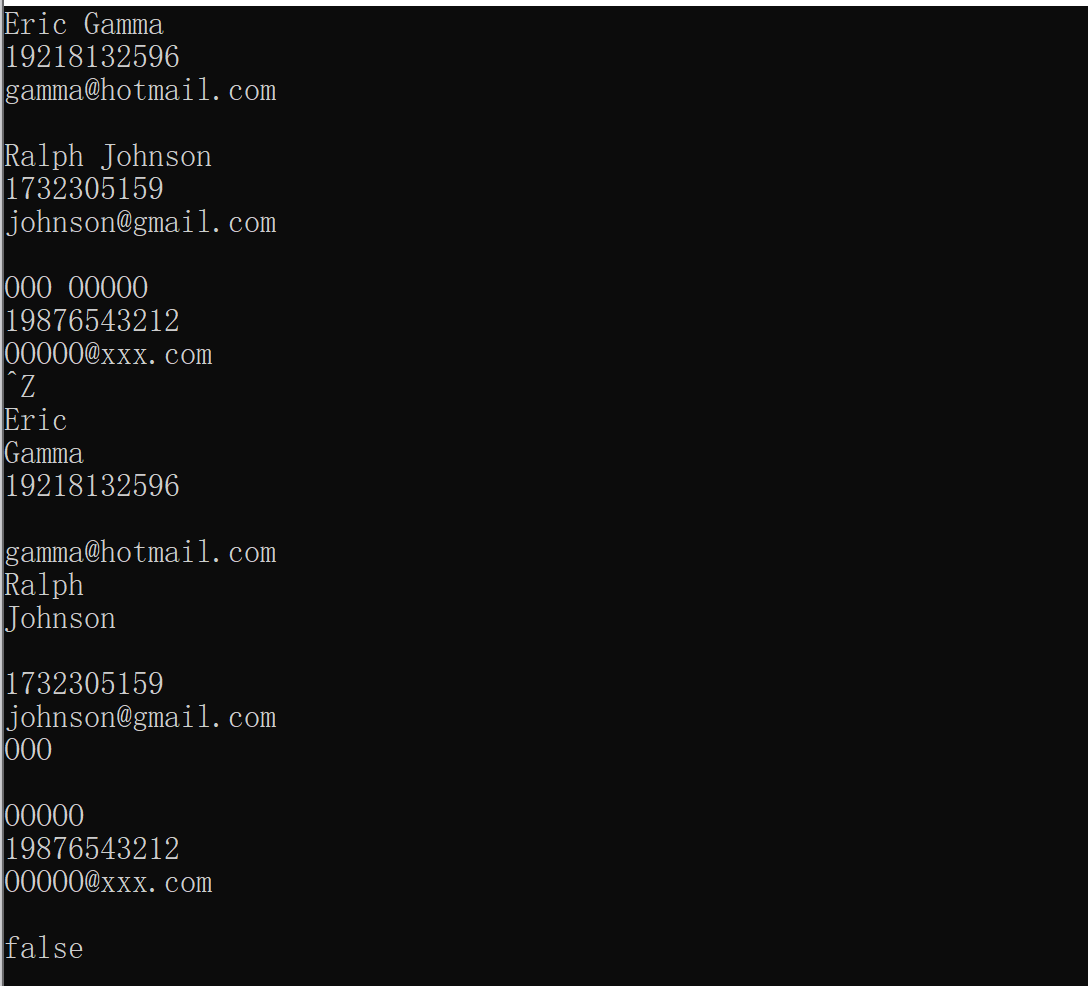 //task2.cpp #include <iostream> #include <fstream> #include <vector> #include "Person.hpp" int main() { using namespace std; vector<Person> phone_book; Person p; while (cin >> p) phone_book.push_back(p); for (auto& i : phone_book) cout << i << endl; cout << boolalpha << (phone_book.at(0) == phone_book.at(1)) << endl; ofstream fout; fout.open("phone_book.txt"); if (!fout.is_open()) { cerr << "fail to open file phone_book.txt\n"; return 1; } for (auto& i : phone_book) fout << i << endl; fout.close(); }