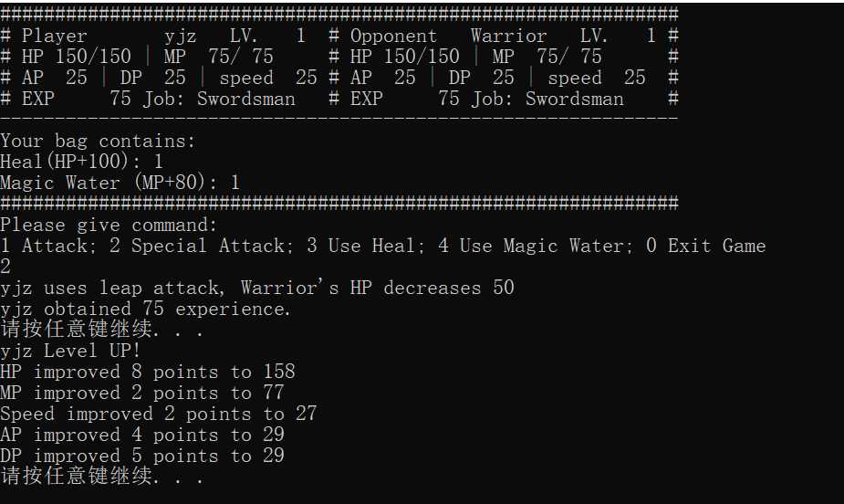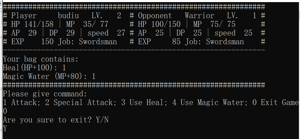 //======================= // main.cpp //======================= // main function for the RPG style game #include"container.h" #include"player.h" #include <iostream> #include <string> using namespace std; #include "swordsman.h" int main() { string tempName; bool success = 0; //flag for storing whether operation is successful cout << "Please input player's name: "; cin >> tempName; // get player's name from keyboard input player * human=0; // use pointer of base class, convenience for polymorphism int tempJob; // temp choice for job selection do { cout << "Please choose a job: 1 Swordsman, 2 Archer, 3 Mage" << endl; cin >> tempJob; system("cls"); // clear the screen switch (tempJob) { case 1: human = new swordsman(1, tempName); // create the character with user inputted name and job success = 1; // operation succeed break; default: break; // In this case, success=0, character creation failed } } while (success != 1); // so the loop will ask user to re-create a character int tempCom; // temp command inputted by user int nOpp = 0; // the Nth opponent for (int i = 1; nOpp < 5; i += 2) // i is opponent's level { nOpp++; system("cls"); cout << "STAGE" << nOpp << endl; cout << "Your opponent, a Level " << i << " Swordsman." << endl; system("pause"); swordsman enemy(i, "Warrior"); // Initialise an opponent, level i, name "Junior" human->reFill(); // get HP/MP refill before start fight while (!human->death() && !enemy.death()) // no died { success = 0; while (success != 1) { showinfo(*human, enemy); // show fighter's information cout << "Please give command: " << endl; cout << "1 Attack; 2 Special Attack; 3 Use Heal; 4 Use Magic Water; 0 Exit Game" << endl; cin >> tempCom; switch (tempCom) { case 0: cout << "Are you sure to exit? Y/N" << endl; char temp; cin >> temp; if (temp == 'Y' || temp == 'y') return 0; else break; case 1: success = human->attack(enemy); human->isLevelUp(); enemy.isDead(); break; case 2: success = human->specialatt(enemy); human->isLevelUp(); enemy.isDead(); break; case 3: success = human->useHeal(); break; case 4: success = human->useMW(); break; default: break; } } if (!enemy.death()) // If AI still alive enemy.AI(*human); else // AI died { cout << "YOU WIN" << endl; human->transfer(enemy); // player got all AI's items } if (human->death()) { system("cls"); cout << endl << setw(50) << "GAME OVER" << endl; human->isDead(); // player is dead, program is getting to its end, what should we do here? system("pause"); return 0; } } } human->reFill(); // You win, program is getting to its end, what should we do here? system("cls"); cout << "Congratulations! You defeated all opponents!!" << endl; system("pause"); return 0; }