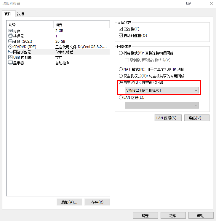 后来自己添加一个VMnet2并设置为仅主机模式的类型,然后把虚机的网络连接用自定义的方式选VMnet2后搞定。原因至今不明!