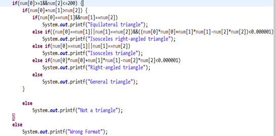 在课上老师进行圈复杂度讲解演示时,一开始采用了if语句,圈复杂度较大,后面改成了switch语句,圈复杂度减少,原因是switch采用的是匹配模式,而不是逐个判断。所以这里的改进思路为将if语句改成switch语句,可以在switch后的表达式设置为ture,而后每个case后的表达式采用条件判断,以达到匹配的效果,从而降低圈复杂度。在写这道题时,也踩了几个坑,在编写条件判断式时逻辑混乱,将等腰直角三角形的判断语句放在等腰三角形和直角三角形之后,导致一直无法输出正确的结果,还有就是浮点数的比较不能直接使用==进行判断,因为浮点数在计算机中采用的储存方式是近似的,如果直接比较的话可能会因为误差原因导致结果不正确。这里应该要采用做差小于一个数的方式来进行浮点数的比较。总体而言,题目集一的7-8难度不高,但是要求有很高的逻辑性,代码也需要继续优化。
