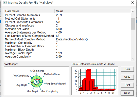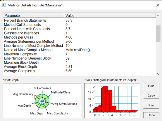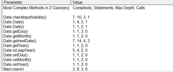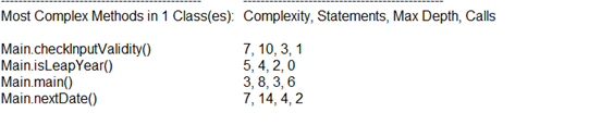 在这个程序中用到的四个方法中,checkInputValidity()和nextDate()的圈复杂度较高,均为七,分析两个方法的代码