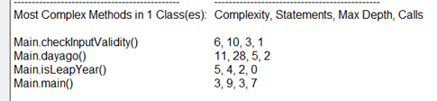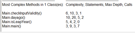 checkInputValidity()方法中调用了isLeapYear(),并且该方法有三个出口(即三个return),这是圈复杂度增加的主要部位,改进方法:可以将两个return false;整合到一起不采用if语句的嵌套,这样预计圈复杂度能降到4左右。