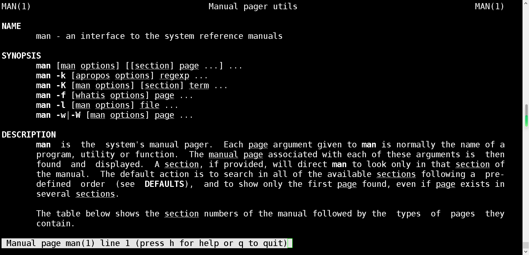 Conventional section names include NAME, SYNOPSIS, CONFIGURATION, DESCRIPTION, OPTIONS, EXIT STATUS, RETURN VALUE, ERRORS, ENVIRONMENT, FILES, VERSIONS, CONFORMING TO, NOTES, BUGS, EXAMPLE, AUTHORS, and SEE ALSO. 上述只列出了常规的部分,不代表全部,个人认为上述标黄的部分为基础部分,也十分常用,NAME名称(类似命令简述,可用做man -k搜索内容);SYNOPSIS格式(介绍了命令的语法格式);DESCRIPTION描述(详细描述了命令);OPTIONS选项(介绍了命令后跟的各选项的作用)。