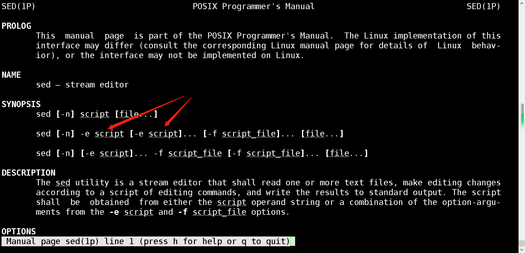 [-abc] any or all arguments within [ ] are optional.(我理解的意思是[ ]内的内容是可选的,即可以写,也可以不写,例如sed [-n],可以加-n,也可以不加-n)