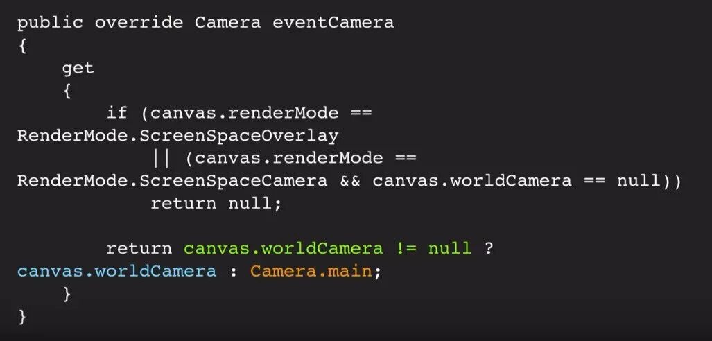 如果将世界空间画布的Event Camera字段留空,这不意味着该画布不会接收事件。它会使用游戏的主摄像机。为了确定哪个摄像机是主摄像机,该画布会访问Camera.main属性。