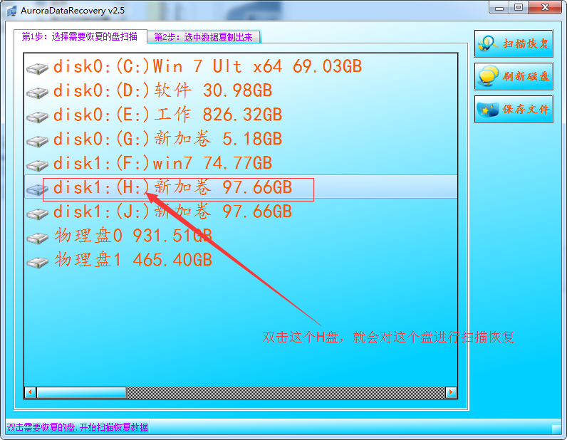步骤2:程序运行后,直接双击需要恢复数据的盘,后点右上角的《扫描恢复》按钮,就可以开始扫描数据了。